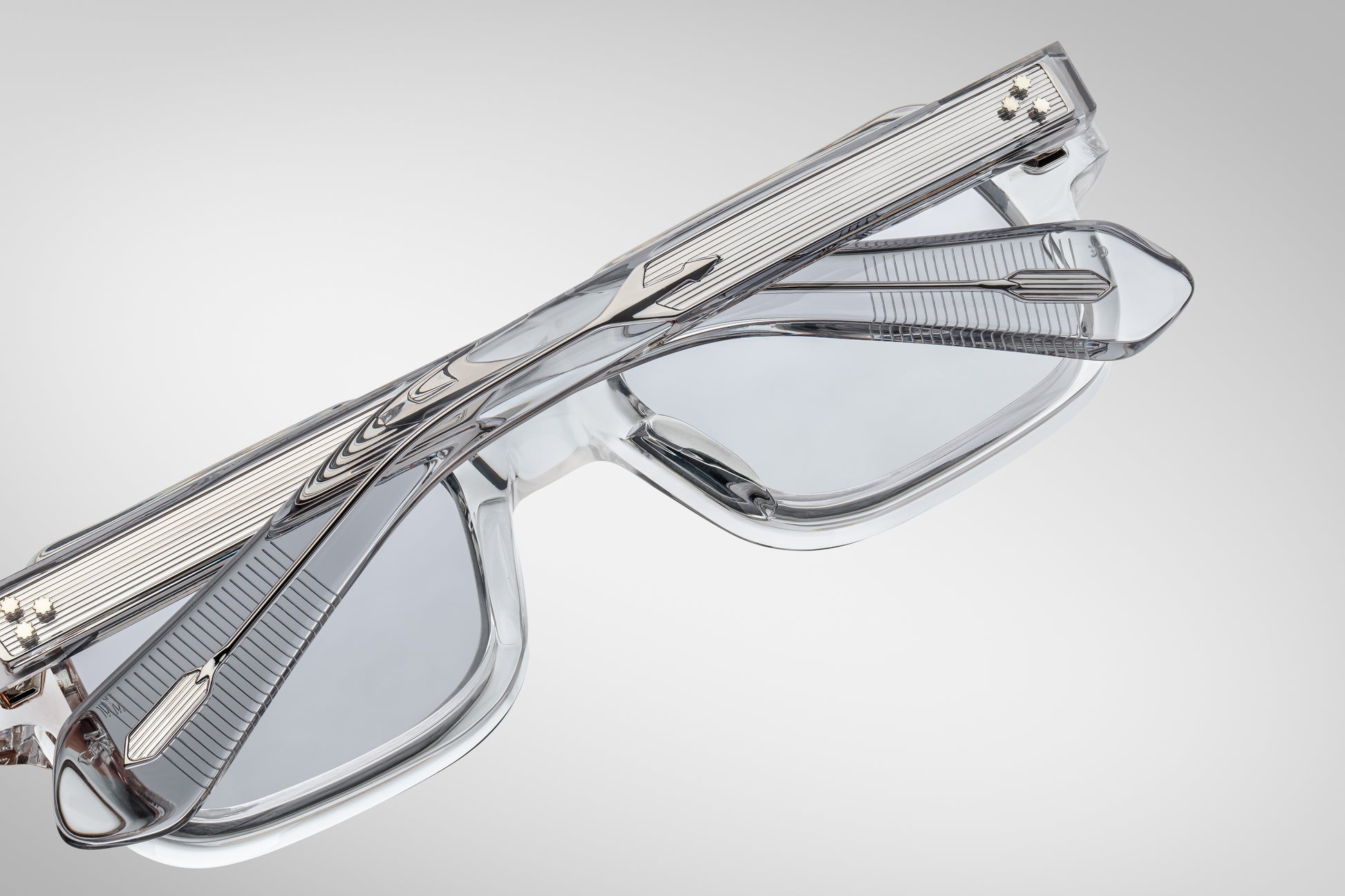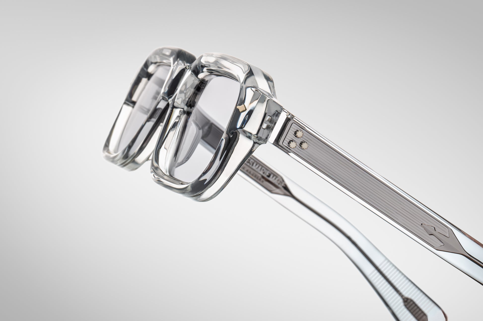 A '90s-inspired frame with dynamic volumes and a unique hexagonal temple tip. Features a crystal 10mm cured cellulose acetate frame, custom double laminated acetate temples, and grey lenses. Includes a silver signature arrowhead front pin, exposed silver emperor wirecore, and a silver tension-secured custom 7 barrel hinge. The lenses are STORM CR39 4 base with backside anti-reflective treatment.