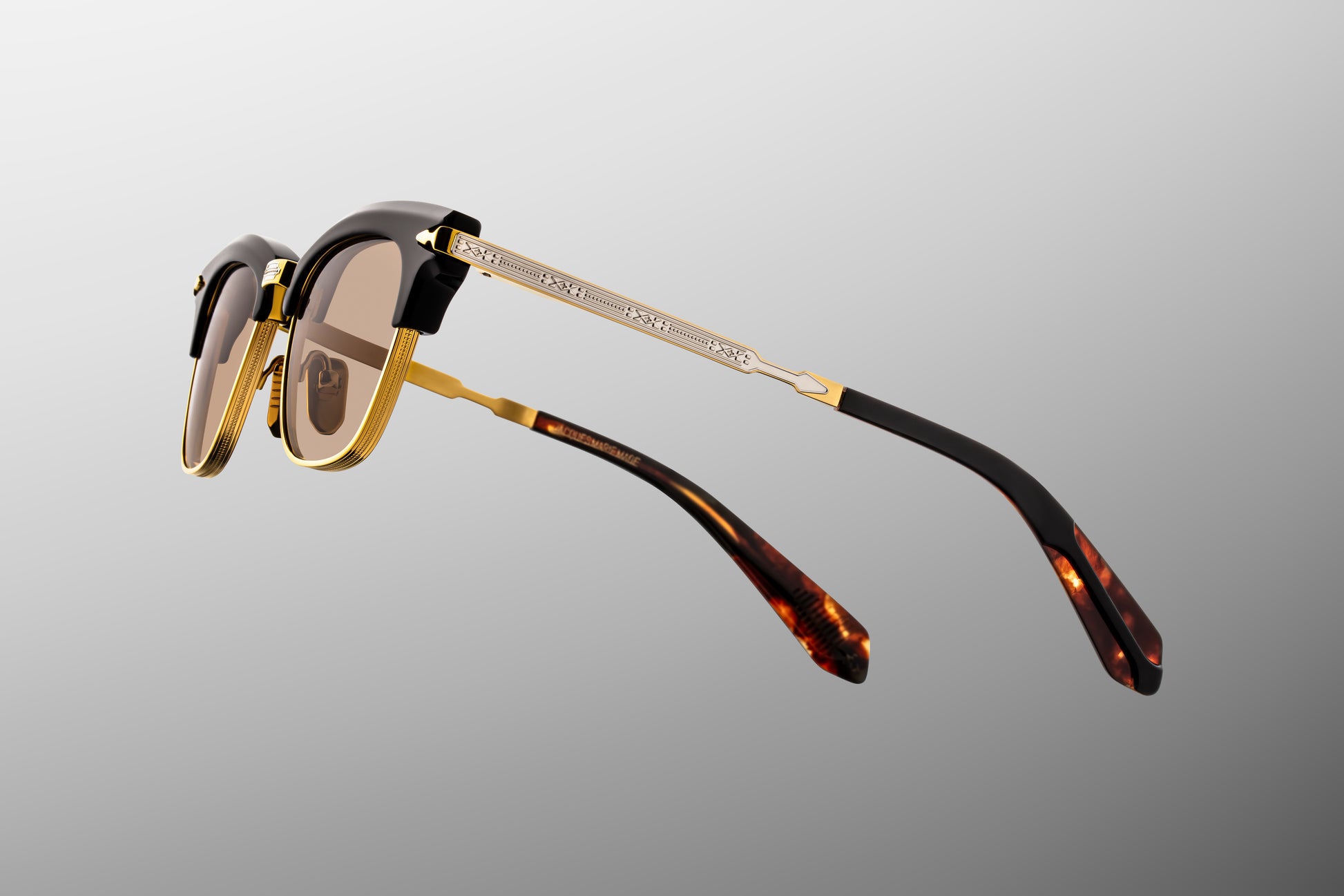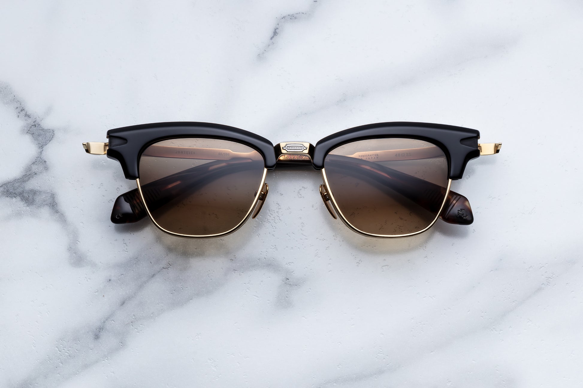 Classic ’50s-inspired combo spectacles with prominent 10mm acetate brow, round titanium eye rims, our signature arrowhead monoblock hinges, and finely engraved titanium temples with a unique arrowhead motif and acetate temple tips.
