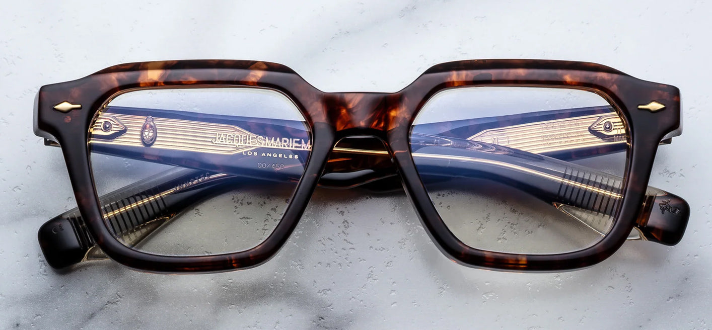 Experience mid-century sophistication with these square, ’50s-inspired optical glasses. Featuring signature arrowhead front-pins, spur-shaped rivets, and Art Deco wirecore details, they offer a perfect blend of style and function. The havana acetate frame and light brown lenses complete the look, while custom stainless steel hinges ensure durability.