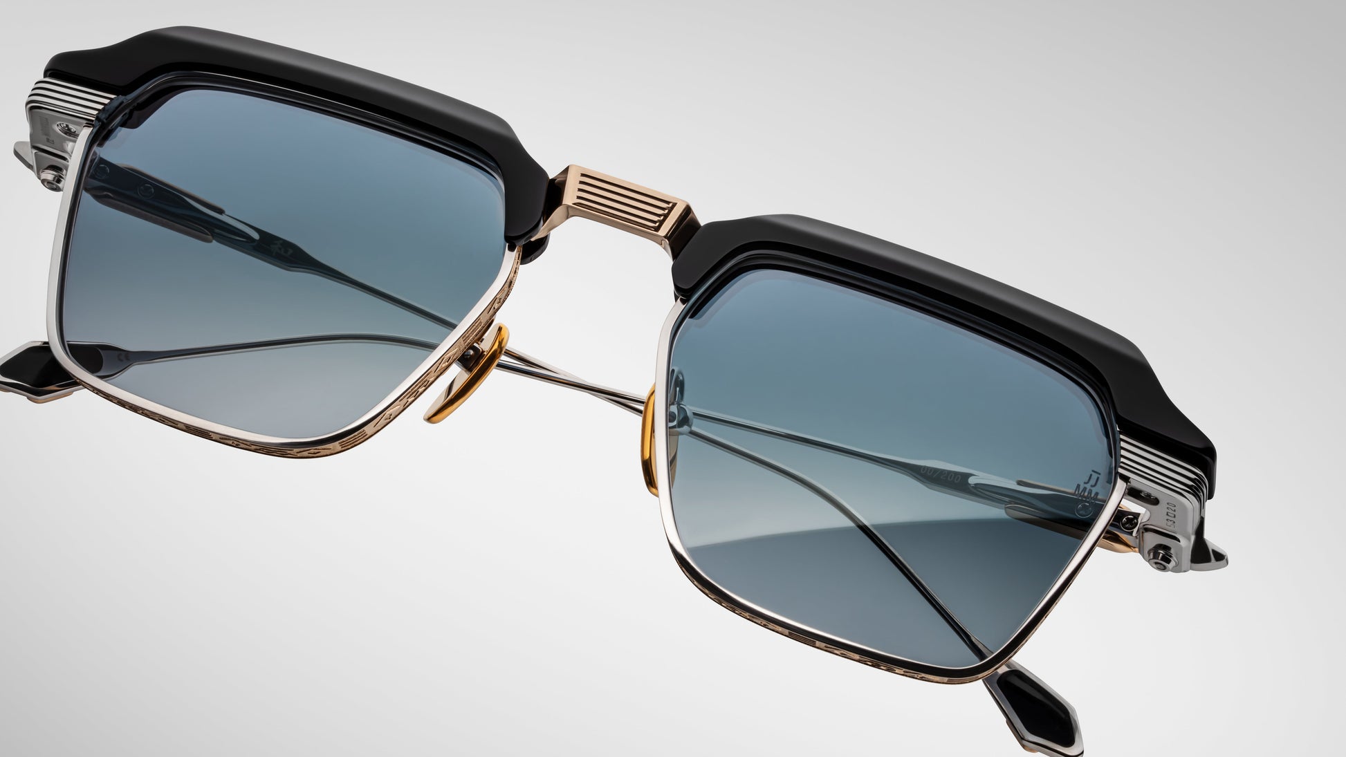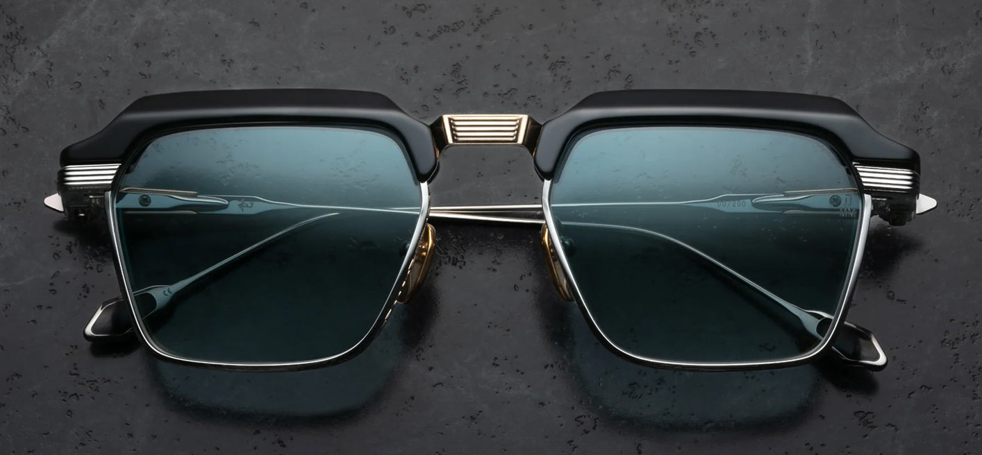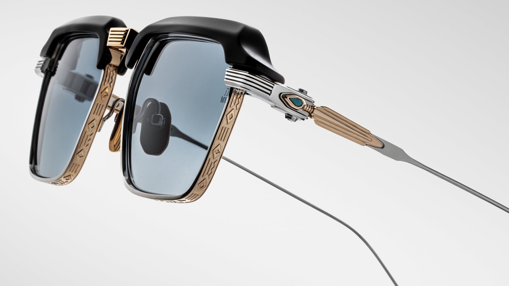 Experience timeless style with these '50s-inspired square spectacles. Featuring a bold acetate top bar and intricately engraved titanium rims, they boast a sculptural arrowhead temple motif and 'thunderbird' medallions with turquoise inlays. The silver beta titanium temples and custom monoblock hinge ensure durability, while the gradient lenses offer clarity with anti-reflective treatment. Choose between 18k Gold or Sterling Silver accents for a touch of elegance.
