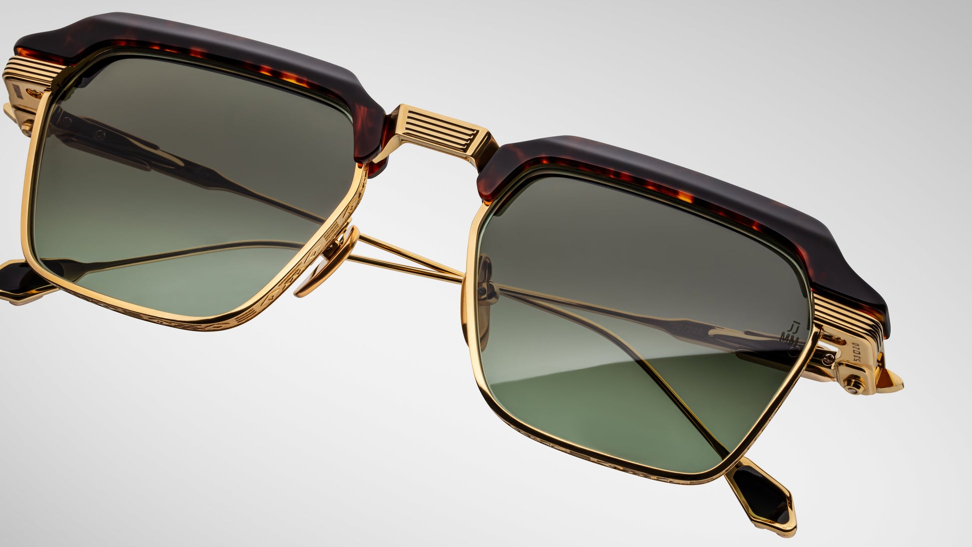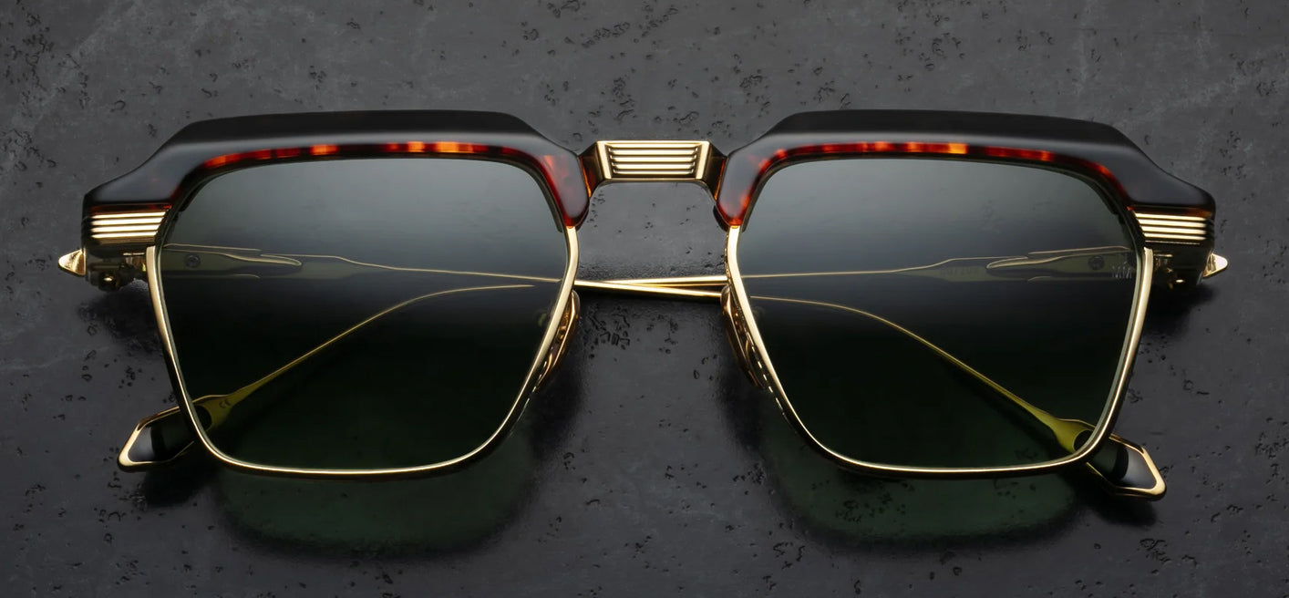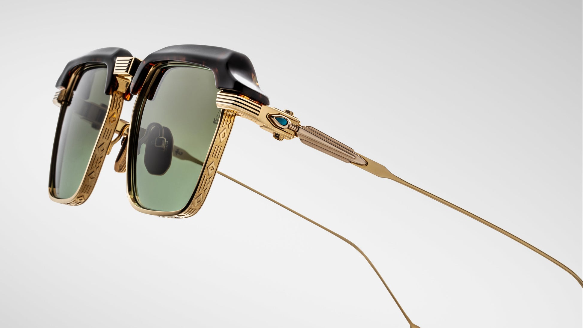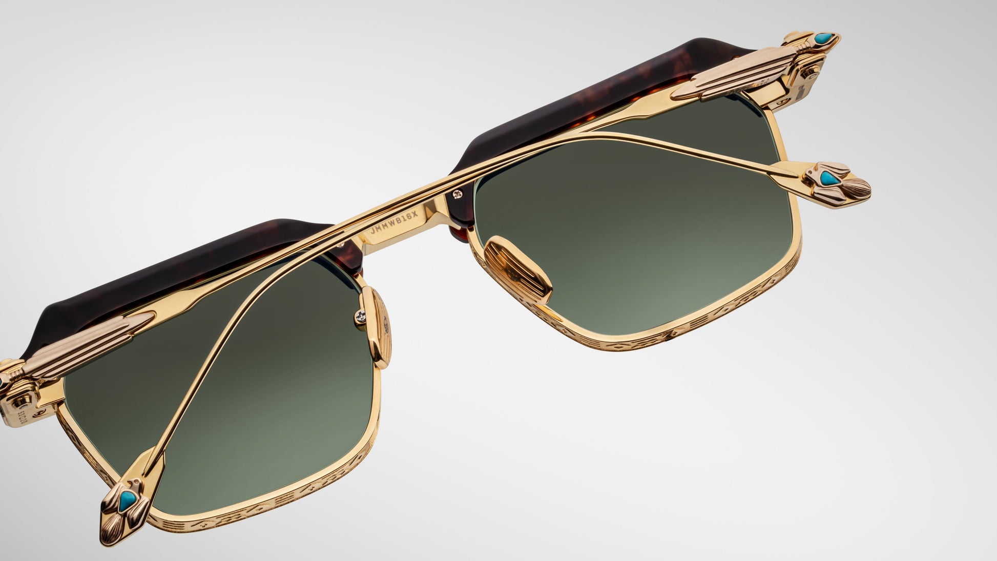 Experience timeless style with these '50s-inspired spectacles featuring a bold acetate top bar and intricately engraved titanium rims. The sculptural arrowhead temples and 'thunderbird' medallions are plated in 18k Gold or Sterling Silver, adorned with turquoise inlays. Enjoy the perfect blend of classic design and modern craftsmanship.